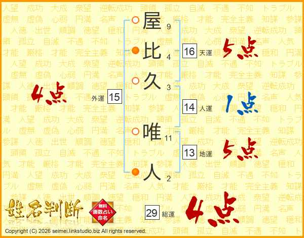 屋比久唯人さんの総運は29画の4点!
