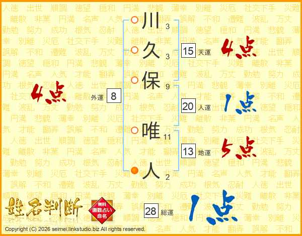 川(3画)久(3画)保(9画) 唯(11画)人(2画)