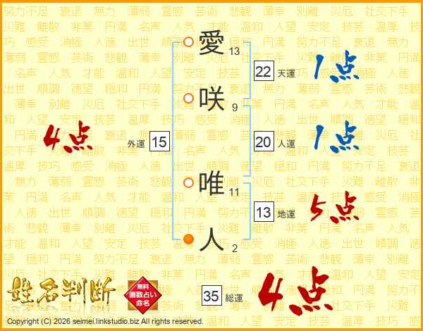 愛(13画)咲(9画) 唯(11画)人(2画)