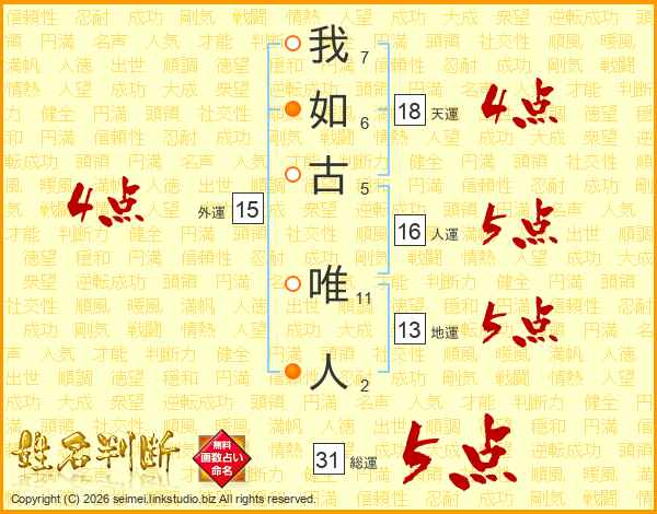 生活面を象徴する運勢です。外部から受ける影響力を表し、結婚運、家庭運や職場、環境への順応性を表します。総運から人運を引いた画数。姓や名が1文字の場合を除く。
