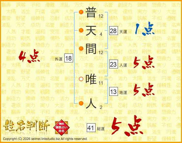 普(12画)天(4画)間(12画) 唯(11画)人(2画)