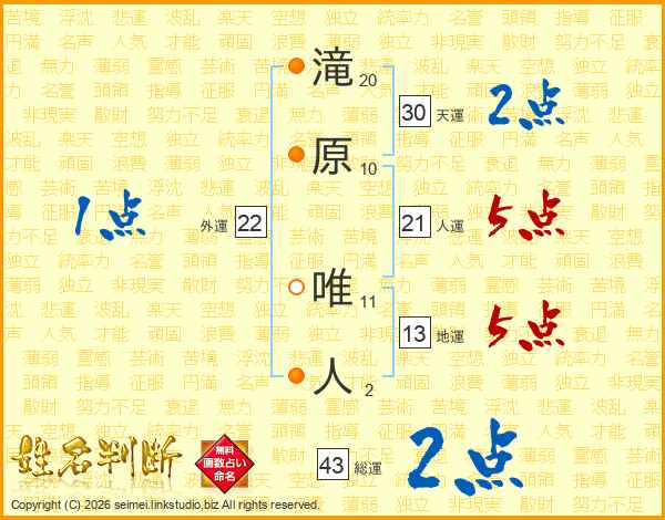 あなたの人生を表す1番重要な運勢です。生涯を通じて影響する総合運となり、主に50歳以降の晩年期に影響を及ぼします。苗字と名前の合計画数。