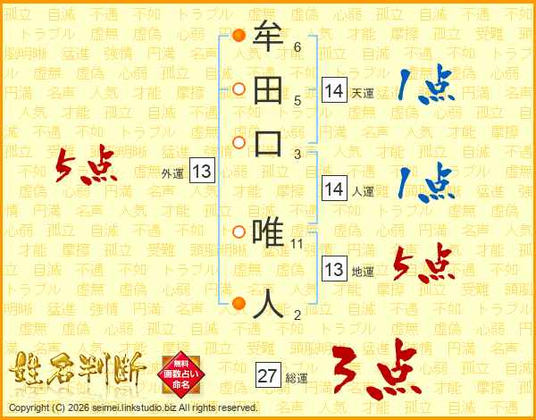 牟(6画)田(5画)口(3画) 唯(11画)人(2画)