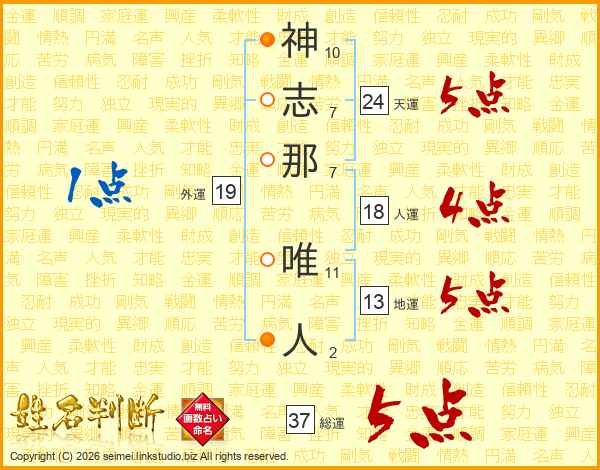 神(10画)志(7画)那(7画) 唯(11画)人(2画)