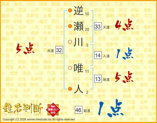 逆(10画)瀬(20画)川(3画) 唯(11画)人(2画)