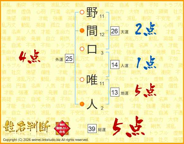 生活面を象徴する運勢です。外部から受ける影響力を表し、結婚運、家庭運や職場、環境への順応性を表します。総運から人運を引いた画数。姓や名が1文字の場合を除く。