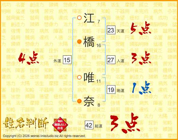 江(7画)橋(16画) 唯(11画)奈(8画)