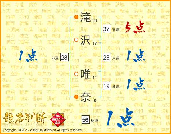 滝(20画)沢(17画) 唯(11画)奈(8画)