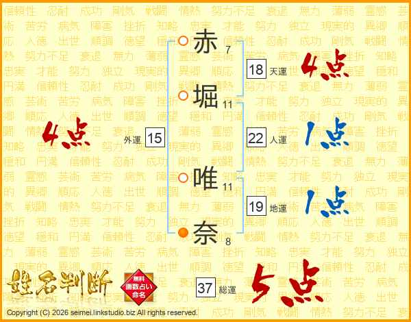赤(7画)堀(11画) 唯(11画)奈(8画)