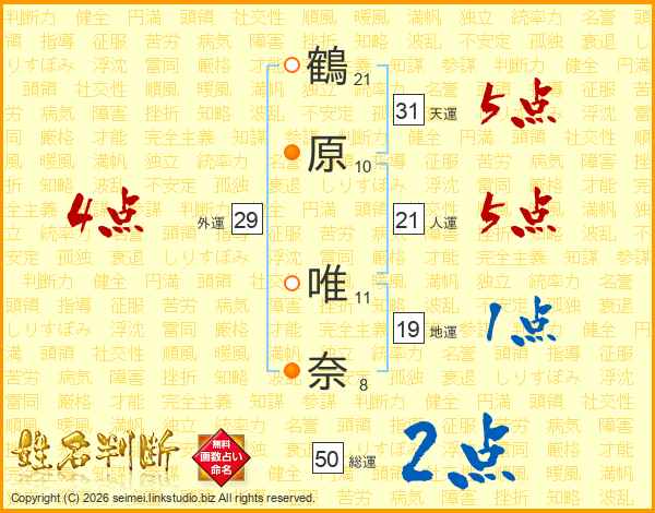 鶴(21画)原(10画) 唯(11画)奈(8画)