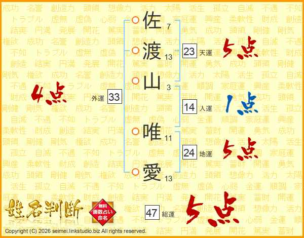 佐(7画)渡(13画)山(3画) 唯(11画)愛(13画)