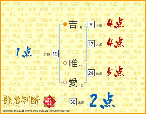吉(6画) 唯(11画)愛(13画)