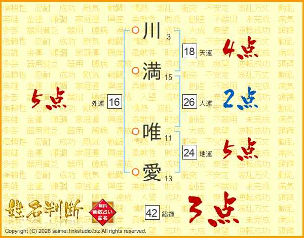 川(3画)満(15画) 唯(11画)愛(13画)