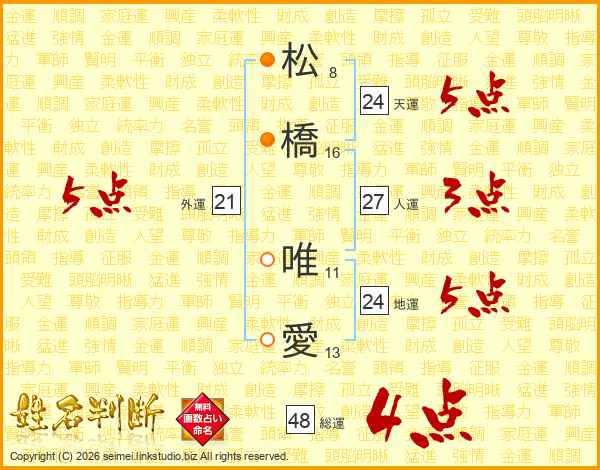 松(8画)橋(16画) 唯(11画)愛(13画)