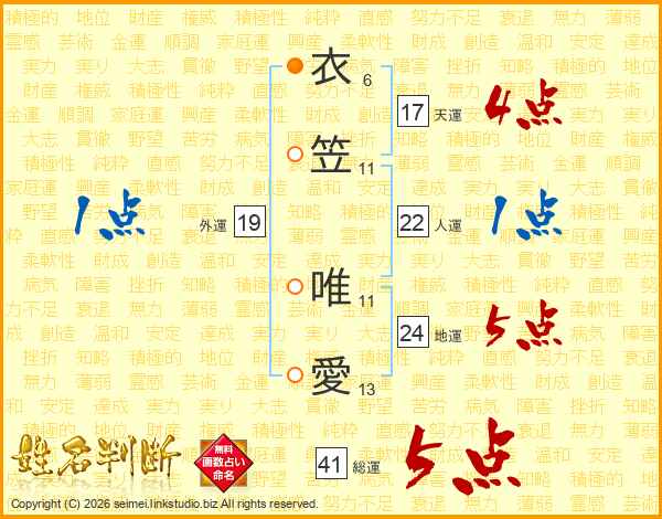 衣(6画)笠(11画) 唯(11画)愛(13画)