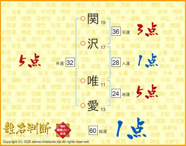 関(19画)沢(17画) 唯(11画)愛(13画)