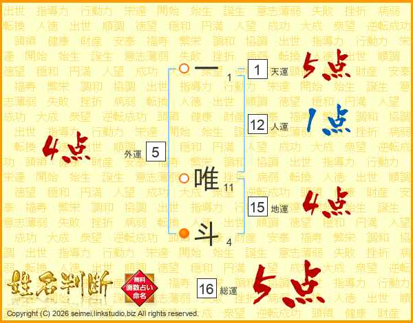 あなたの人生を表す1番重要な運勢です。生涯を通じて影響する総合運となり、主に50歳以降の晩年期に影響を及ぼします。苗字と名前の合計画数。