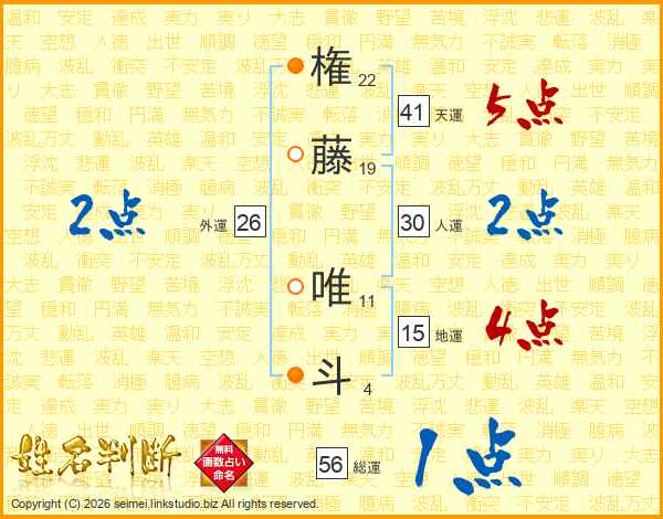 権(22画)藤(19画) 唯(11画)斗(4画)