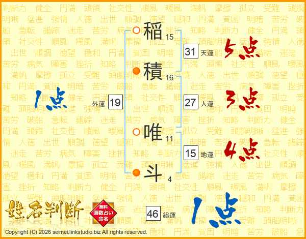 稲(15画)積(16画) 唯(11画)斗(4画)