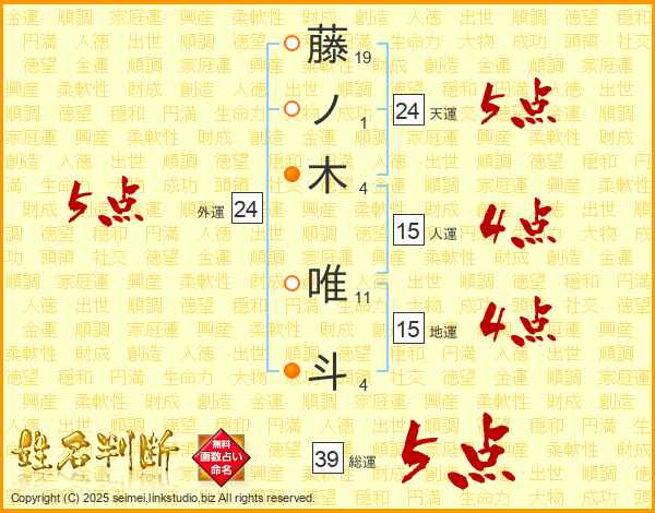藤(19画)ノ(1画)木(4画) 唯(11画)斗(4画)