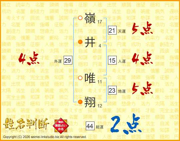 嶺(17画)井(4画) 唯(11画)翔(12画)