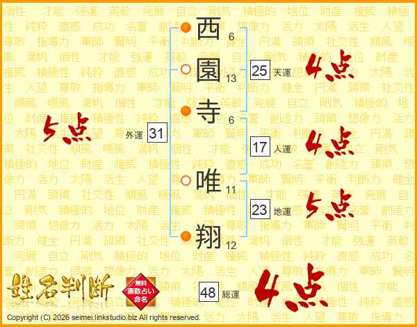 西(6画)園(13画)寺(6画) 唯(11画)翔(12画)