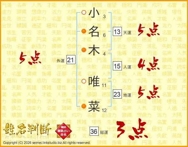 小(3画)名(6画)木(4画) 唯(11画)菜(12画)