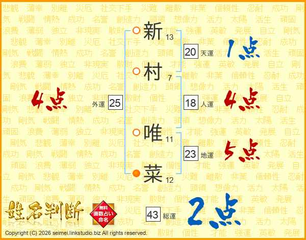 新(13画)村(7画) 唯(11画)菜(12画)