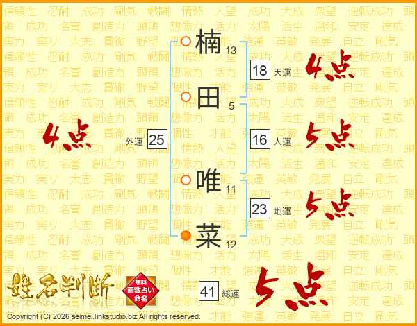 楠(13画)田(5画) 唯(11画)菜(12画)