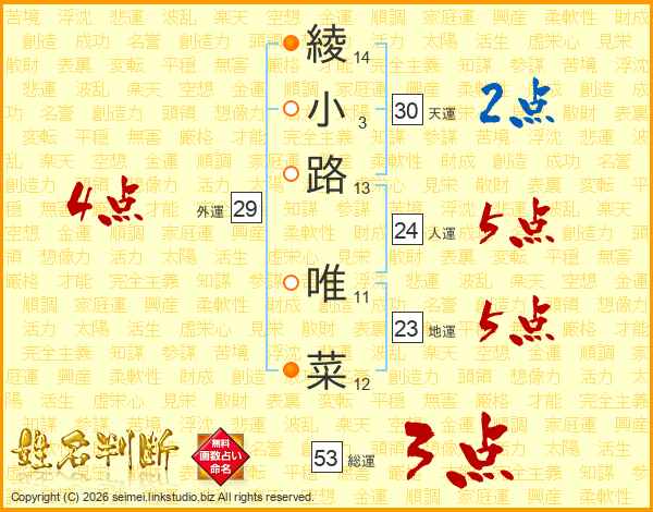 綾(14画)小(3画)路(13画) 唯(11画)菜(12画)
