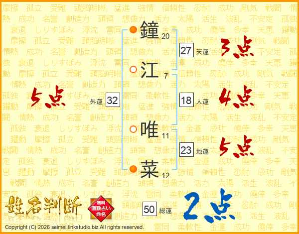 生活面を象徴する運勢です。外部から受ける影響力を表し、結婚運、家庭運や職場、環境への順応性を表します。総運から人運を引いた画数。姓や名が1文字の場合を除く。