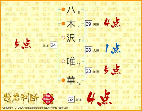 八(8画)木(4画)沢(17画) 唯(11画)華(12画)