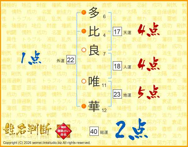 多(6画)比(4画)良(7画) 唯(11画)華(12画)