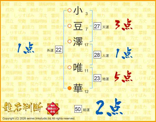 小(3画)豆(7画)澤(17画) 唯(11画)華(12画)