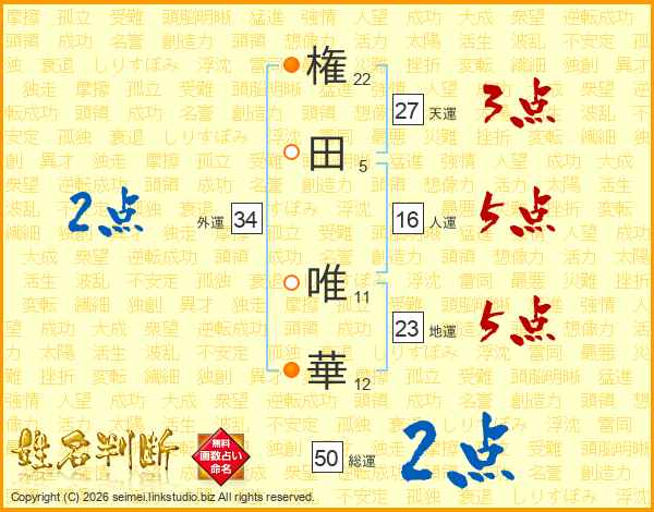 生活面を象徴する運勢です。外部から受ける影響力を表し、結婚運、家庭運や職場、環境への順応性を表します。総運から人運を引いた画数。姓や名が1文字の場合を除く。