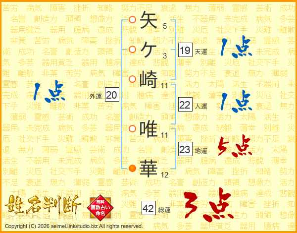 矢(5画)ケ(3画)崎(11画) 唯(11画)華(12画)