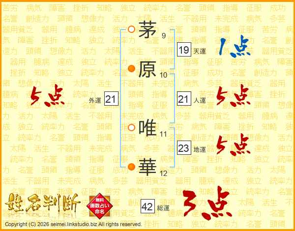 茅原唯華さんの人運は21画の5点!