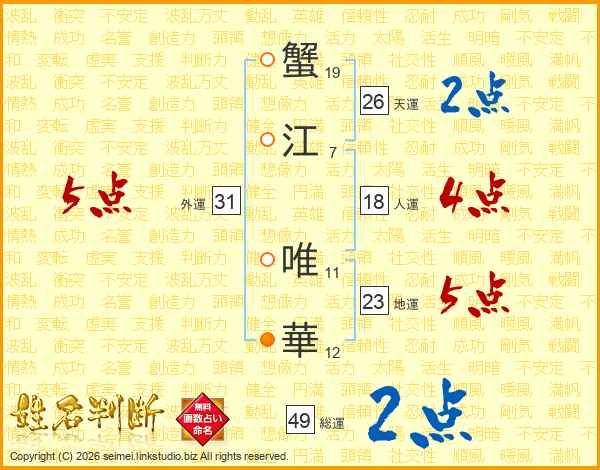 蟹(19画)江(7画) 唯(11画)華(12画)