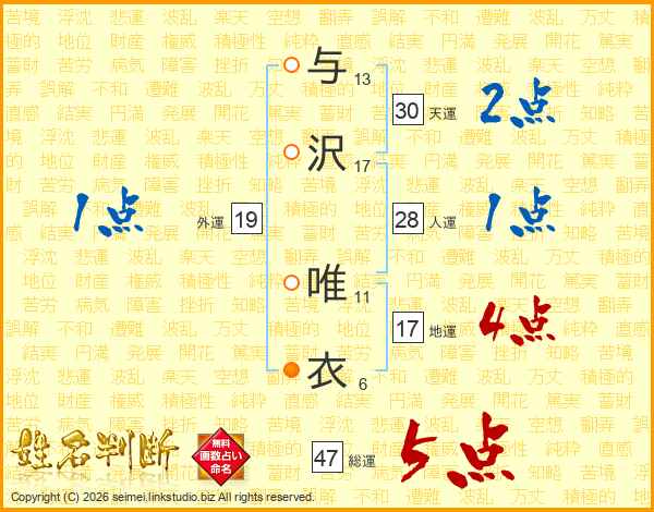 与沢唯衣さんの総運は47画の5点!