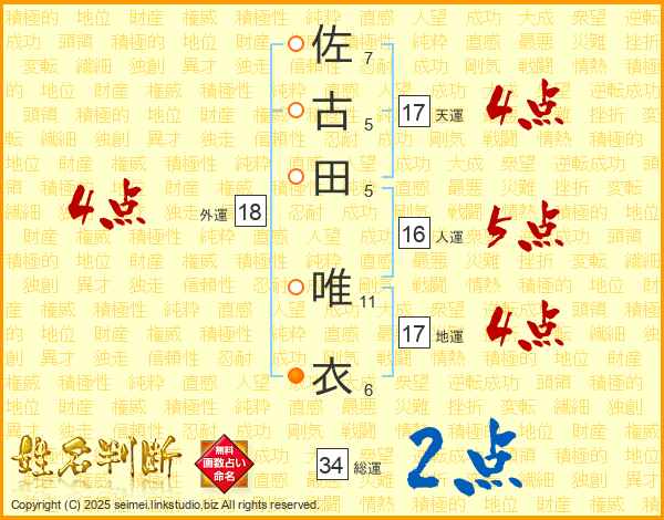 佐(7画)古(5画)田(5画) 唯(11画)衣(6画)