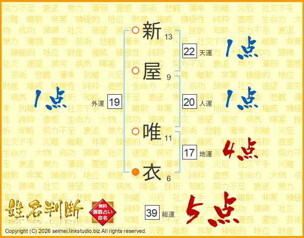 新屋唯衣さんの総運は39画の5点!