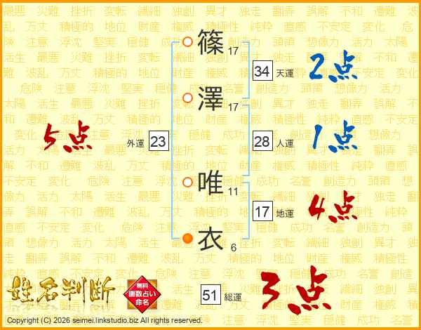 篠(17画)澤(17画) 唯(11画)衣(6画)