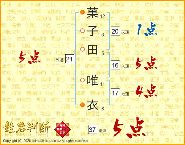 菓(12画)子(3画)田(5画) 唯(11画)衣(6画)
