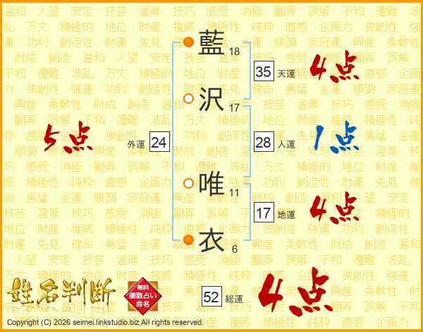 藍(18画)沢(17画) 唯(11画)衣(6画)