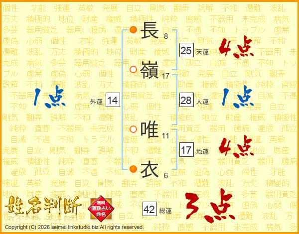 長(8画)嶺(17画) 唯(11画)衣(6画)