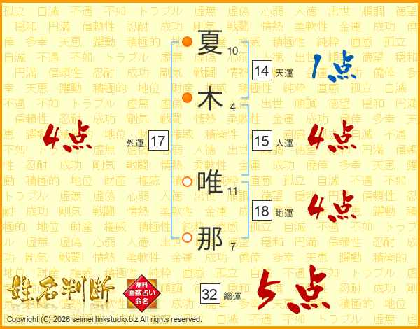 生活面を象徴する運勢です。外部から受ける影響力を表し、結婚運、家庭運や職場、環境への順応性を表します。総運から人運を引いた画数。姓や名が1文字の場合を除く。