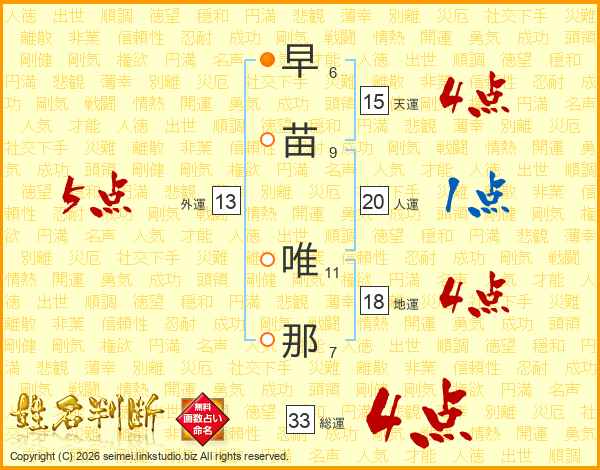 早苗唯那さんの総運は33画の4点!
