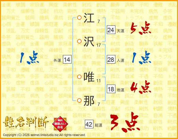 江沢唯那さんの外運は14画の1点!