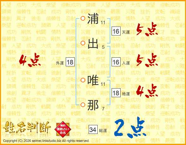 生活面を象徴する運勢です。外部から受ける影響力を表し、結婚運、家庭運や職場、環境への順応性を表します。総運から人運を引いた画数。姓や名が1文字の場合を除く。