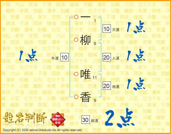 生活面を象徴する運勢です。外部から受ける影響力を表し、結婚運、家庭運や職場、環境への順応性を表します。総運から人運を引いた画数。姓や名が1文字の場合を除く。